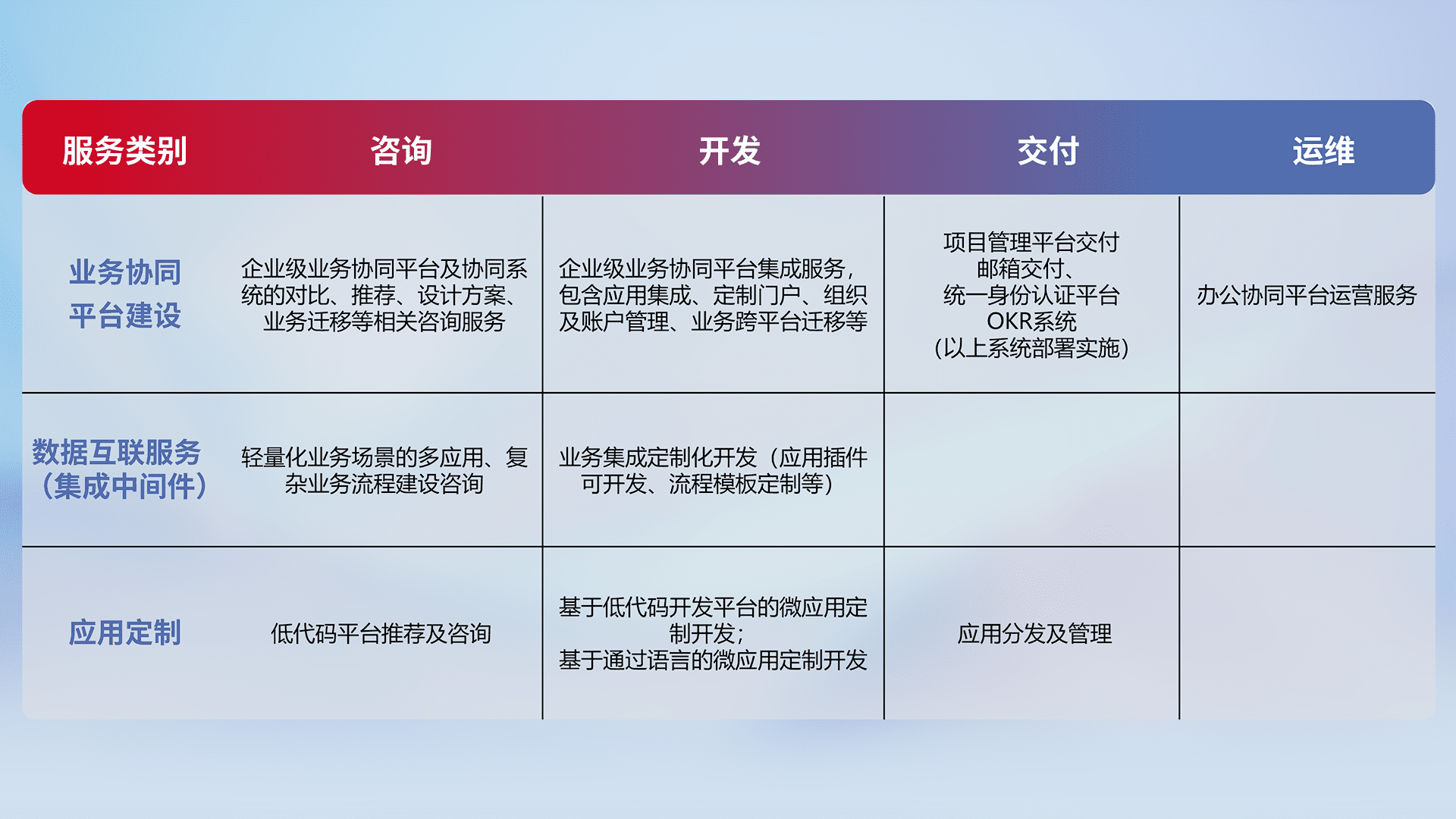 针对钉钉、、、企微、、IDaas等平台级产品提供产品的规划、、方案、、、交付、、、、定制化开发等服务,,,实现如统一协同办公、、智能客户服务、、、、混合会议管理、、、智能数据查询、、等业务场景,,,实现数字化转型。。